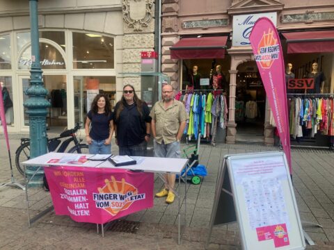 Im „Finger weg vom Sozialetat“-Demoaufruf heißt es: „Wir erwarten, dass bei notwendigen Haushaltskürzungen der Sozialhaushalt gesondert berücksichtigt wird. Anderenfalls droht das Wegbrechen einer elementaren Säule der Prävention und Sozialen Arbeit in dieser Stadt mit gravierenden Konsequenzen für alle.“