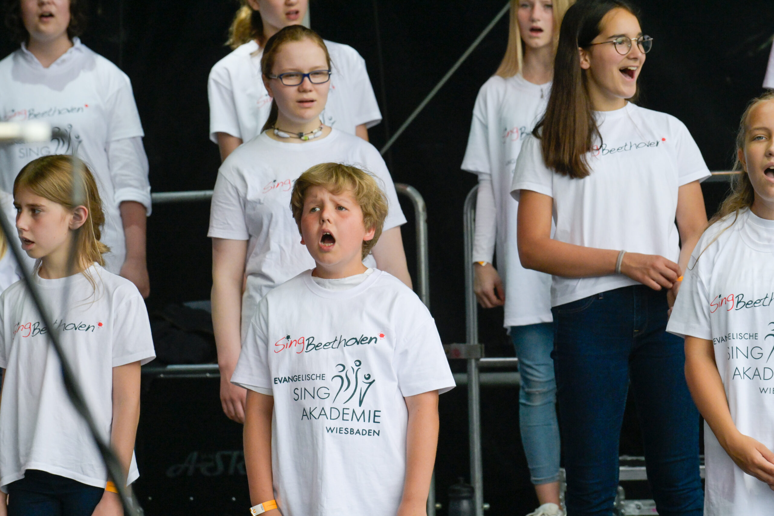 An dem Projekt „Sing Beethoven“ waren rund 200 Sänger*innen der Wiesbadener Schulen und Chöre beteiligt, zusammen mit der Kinderkantorei, Lerchen und Füchse der Evangelischen Singakademie Wiesbaden und der Teeniechor der Musikschule Tübingen unter der Leitung der angesehenen Kinderchorleiterin Friedhilde Trüün. Begleitet wurde das Projekt von dem Frank-Schlichter-Jazz-Ensemble.