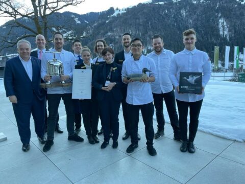 Beim Ausflug in die Berge auch dabei sind natürlich die versierte Sommelière Elena Hart (rechts) und Restaurantchef Anton Steiner. Drei Wochen lang heißt es „Das Beste von der ENTE“ im Grand Tirolia Kitzbühel. Das Menü für 169,00 Euro pro Person besteht aus vielen beliebten Klassikern, allen voran gehobelte Entenleber mit Trockenkirschen-Sherry, Räuchermandeln und Salzbutter-Brioche, gefolgt von Eismeerlachs mit Gemüse und Forellenkaviar, Ravioli vom Kanadischen Hummer, Entengrieben-Knödel mit Sellerie und Périgord Trüffel.