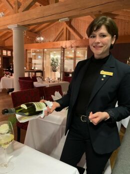Beim Ausflug in die Berge auch dabei sind natürlich die versierte Sommelière Elena Hart (rechts) und Restaurantchef Anton Steiner. Drei Wochen lang heißt es „Das Beste von der ENTE“ im Grand Tirolia Kitzbühel. Das Menü für 169,00 Euro pro Person besteht aus vielen beliebten Klassikern, allen voran gehobelte Entenleber mit Trockenkirschen-Sherry, Räuchermandeln und Salzbutter-Brioche, gefolgt von Eismeerlachs mit Gemüse und Forellenkaviar, Ravioli vom Kanadischen Hummer, Entengrieben-Knödel mit Sellerie und Périgord Trüffel.