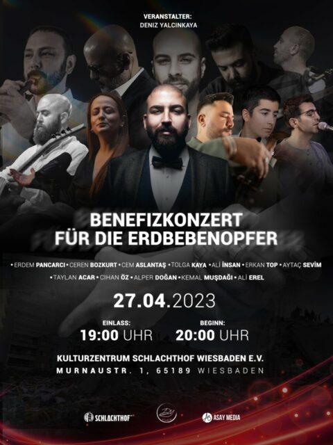 Heute organisiert der Wiesbadener Deniz Yalçınkaya in Kooperation mit dem Kulturzentrum Schlachthof ein Benefizkonzert der türkischen Community im Kesselhaus. Viele bekannte Musiker haben für einen Auftritt zugesagt. Das Benefizkonzert beginnt um 20 Uhr, Einlass ist um 19 Uhr.